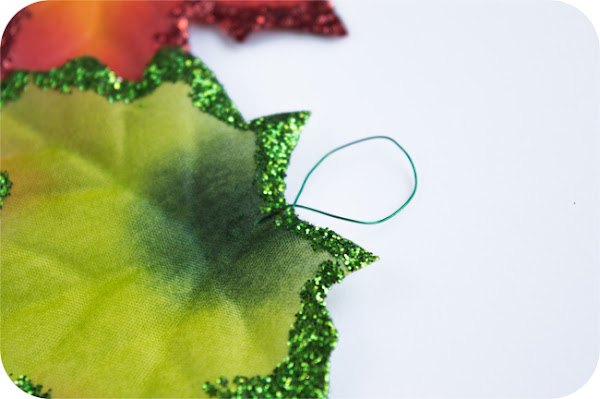 Y para hacerlas básicamente es con un pincel mojar de cola blanca todo el exterior de las hojas e ir espolvoreándole la purpurina encima para que se quede pegada. Una vez retiremos el exceso ponemos en la parte superior el alambre formando una especie de anilla para poder colgarlas del árbol y ¡listo!