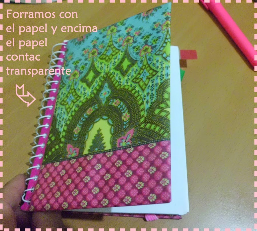 Tomamos el papel de nuestra elección y forramos la agenda (como si fuera un libro), luego del papel colocamos el contac (que es lo más complicado, ya que debemos evitar en lo posible las burbujas de aire para tener un mejor terminado).