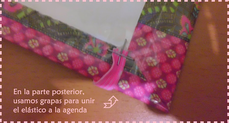 De la tapa posterior de la agenda (en su cara interna) sujetamos la cinta elástica, yo utilice un par de grapas en cada esquina en forma de cruz para que quedaran bien sujetas, recuerda que la cinta la utilizarás cada vez que la abras y/o cierres, así que la sujeción es súper importante...