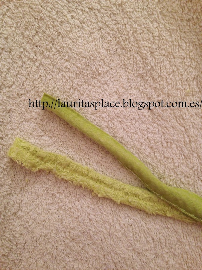 Como quería que fuese reciclado total he aprovechado los bordes de la toalla para cortarlos coincidiendo con los bajos del albornoz y los bajos de las mangas. Para el resto de los bies que necesitaba me he tomado el trabajazo de descoser el bies de las partes de toalla que no iba a usar.