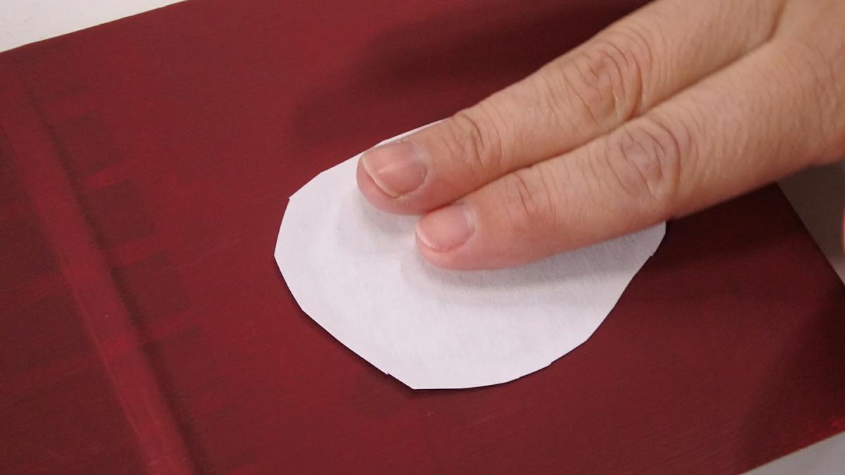 Una vez está fijada, aplicamos una capa uniforme de cera incolora y dejamos secar unos minutos. En este caso yo la he aplicado con un poco de papel ya que a superficie no es muy grande.