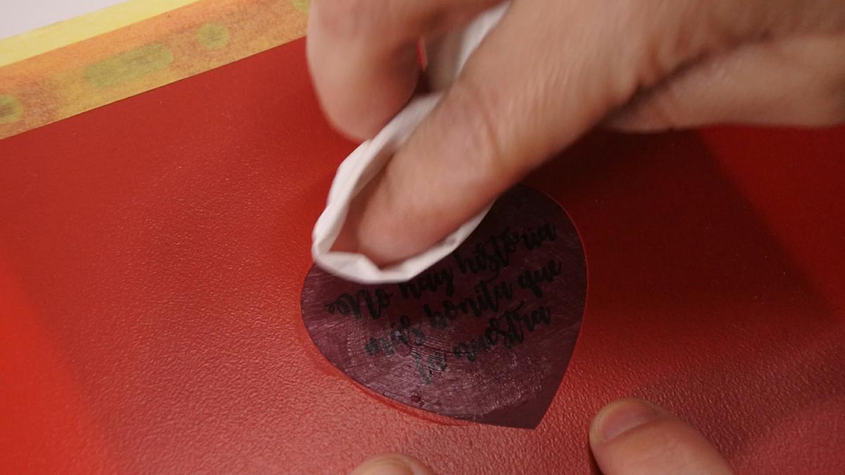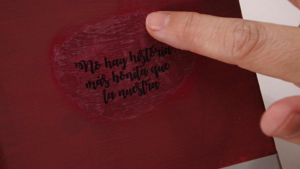 Nosotros hemos elegido una frase: “No hay historia más bonita que la nuestra”. pero por supuesto lo podéis hacer con una frase, una imagen… Colocamos cola para fototransfer sobre la imagen, la pegamos en el lugar deseado haciendo un poco de presión y dejamos secar.