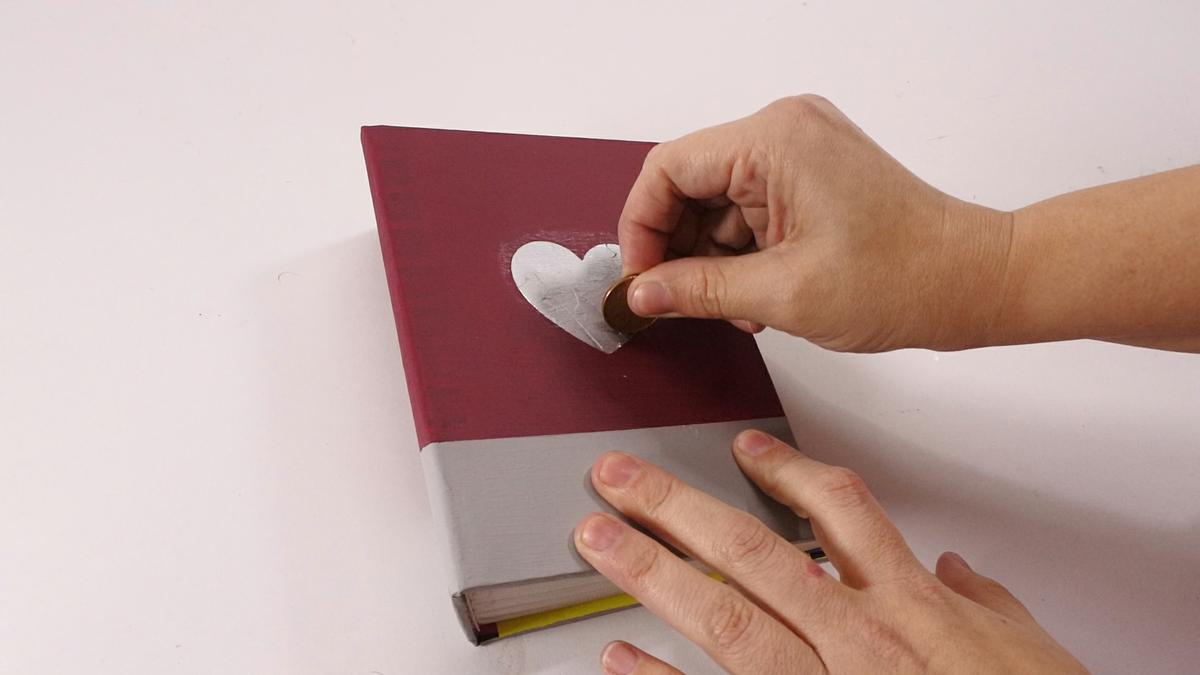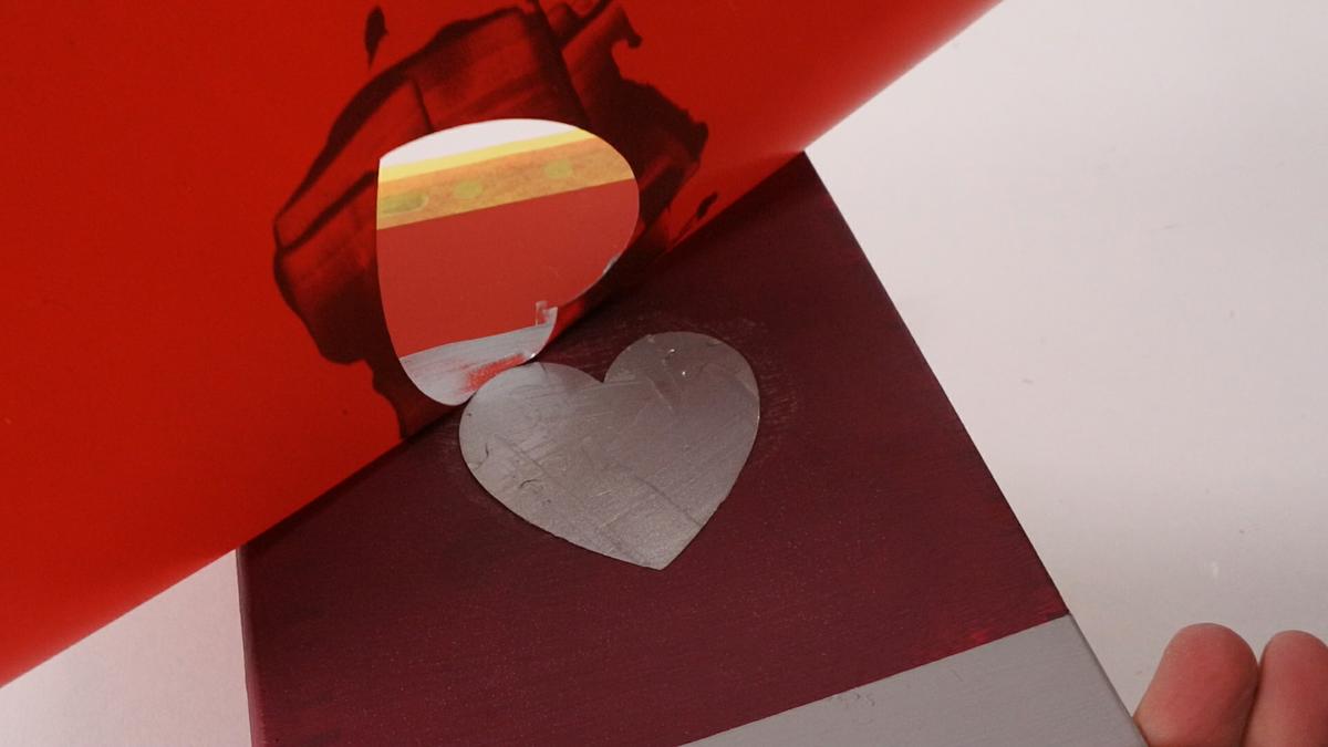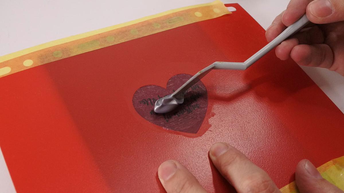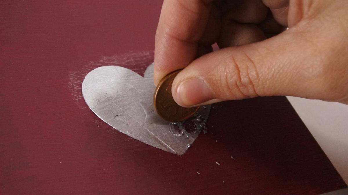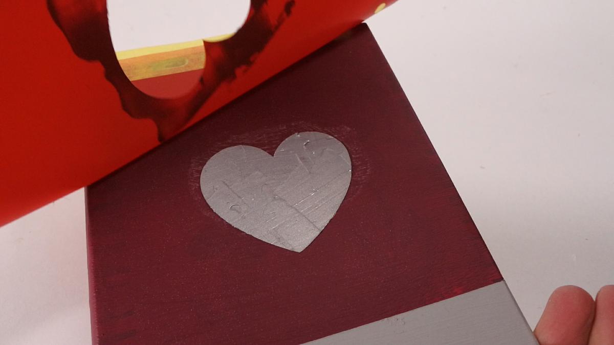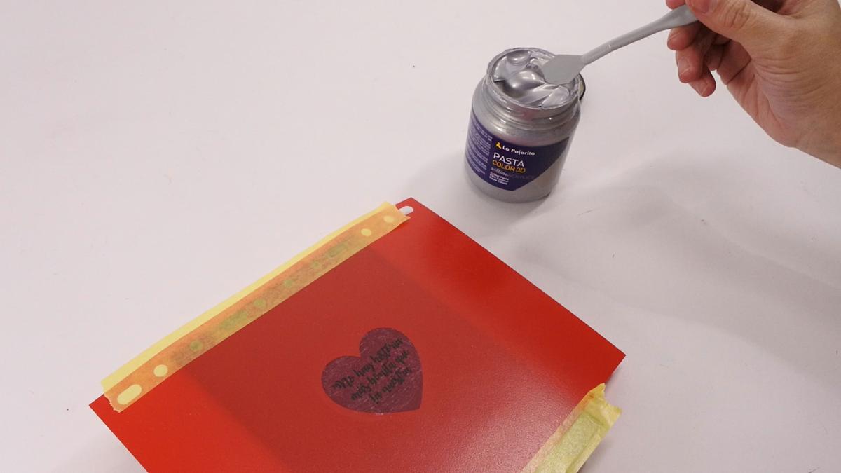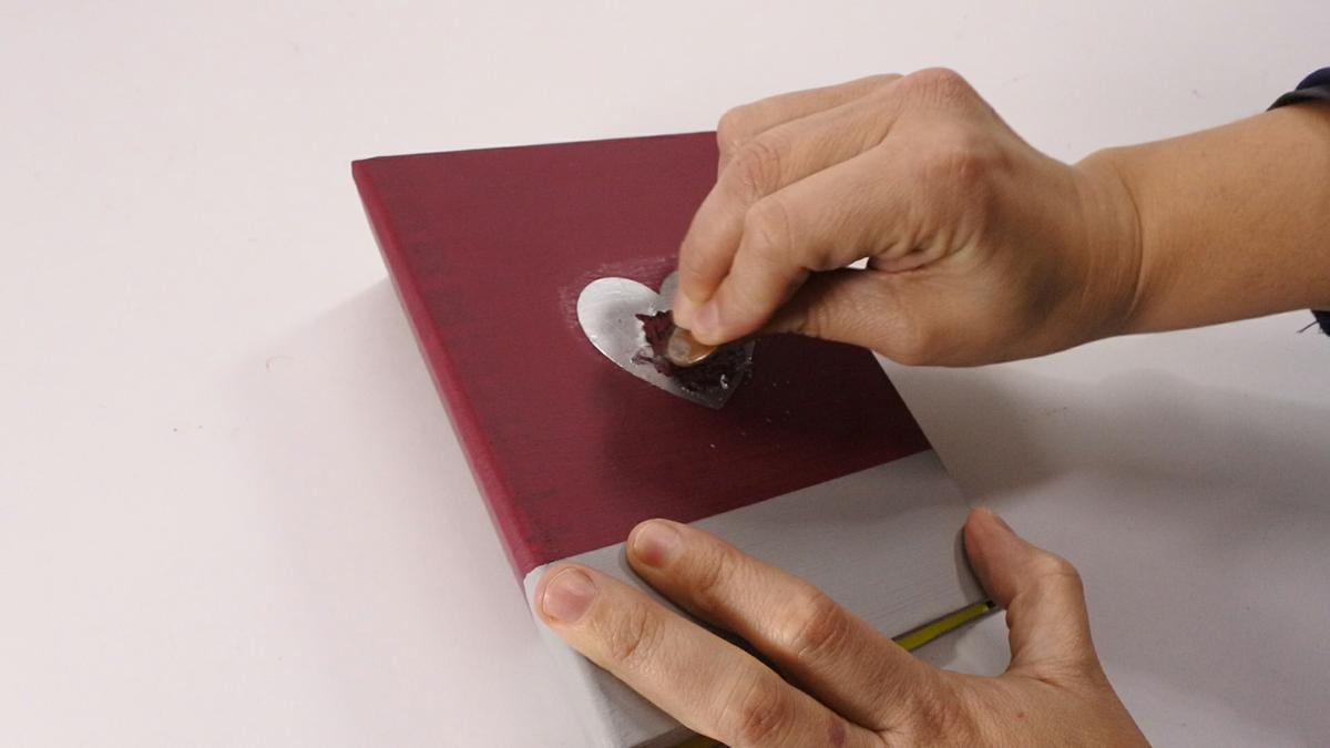 Y ahora comienza lo interesante, vamos a hacer la pintura rascable. Como es San Valentín, nosotros lo vamos a hacer con forma de corazón ayudándonos de una plantilla, pero obviamente lo podéis hacer como más os guste.