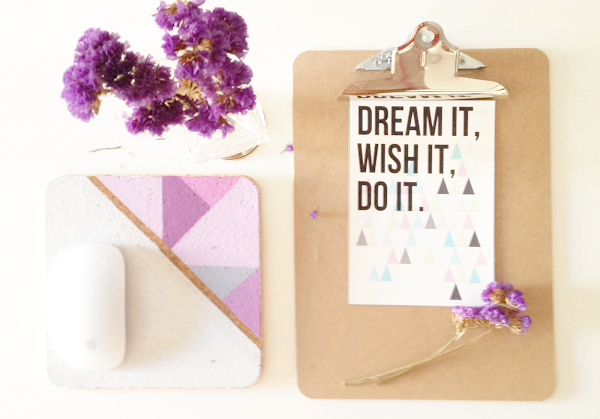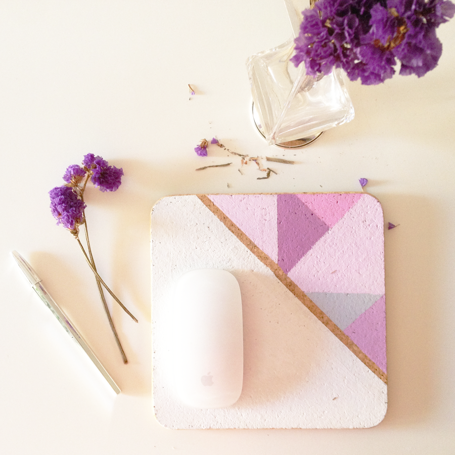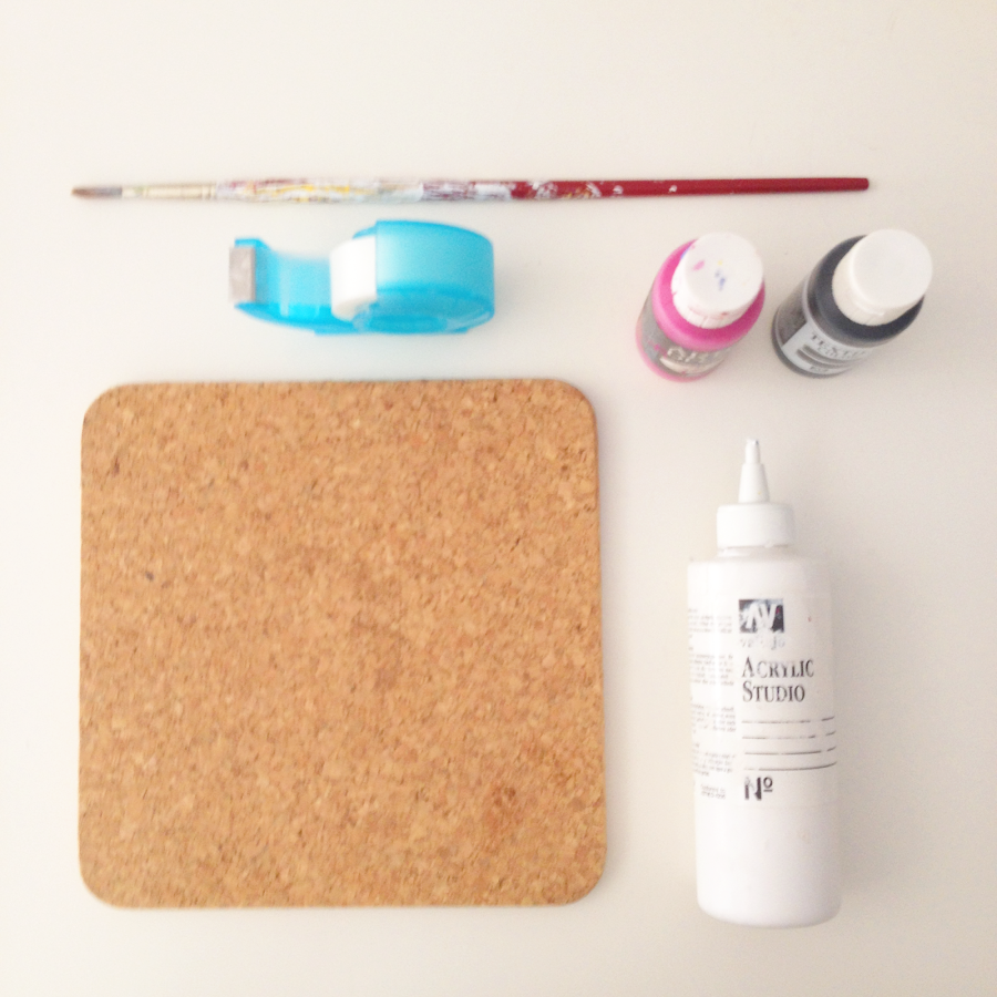 Lo que he utilizado para este diy es un salvamanteles de corcho, un poco de celo, pincel y pintura de los colores que más os gusten (yo he cogido blanco, rosa y negro y los he mezclado para crear esta gama).