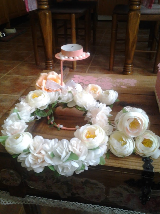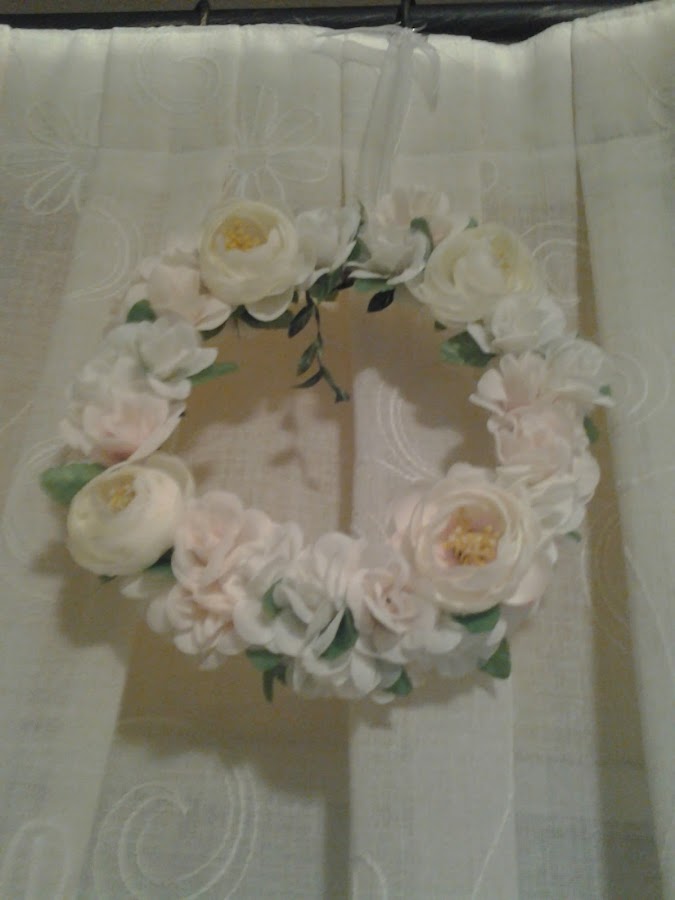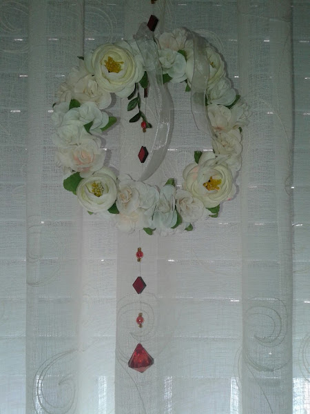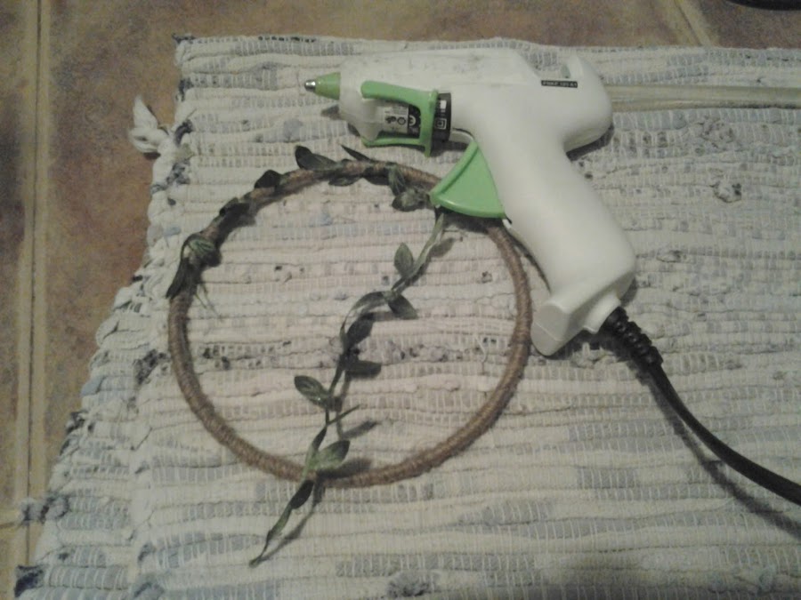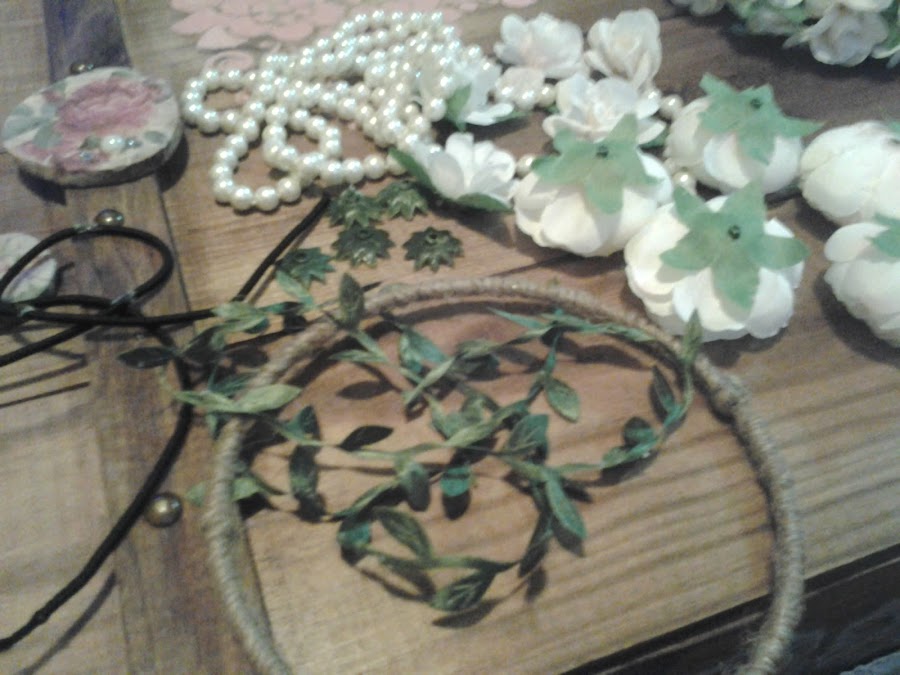 Forré, como ya os he dicho todo el aro con hilo sisal, y con el collar de flores que compré en un bazar, y tenia, por "si acaso... , fui forrando, también con este motivo vegetal , el aro.