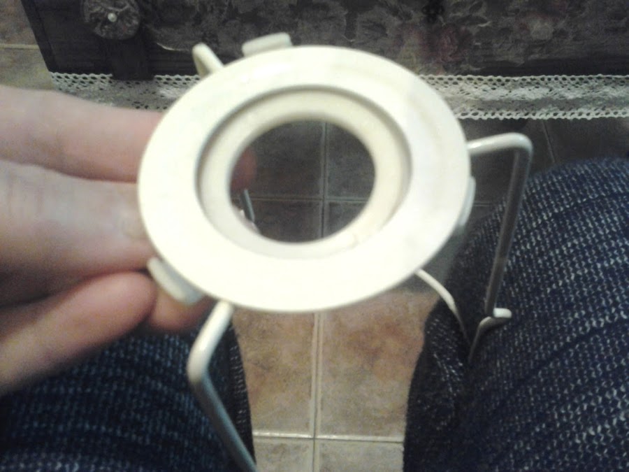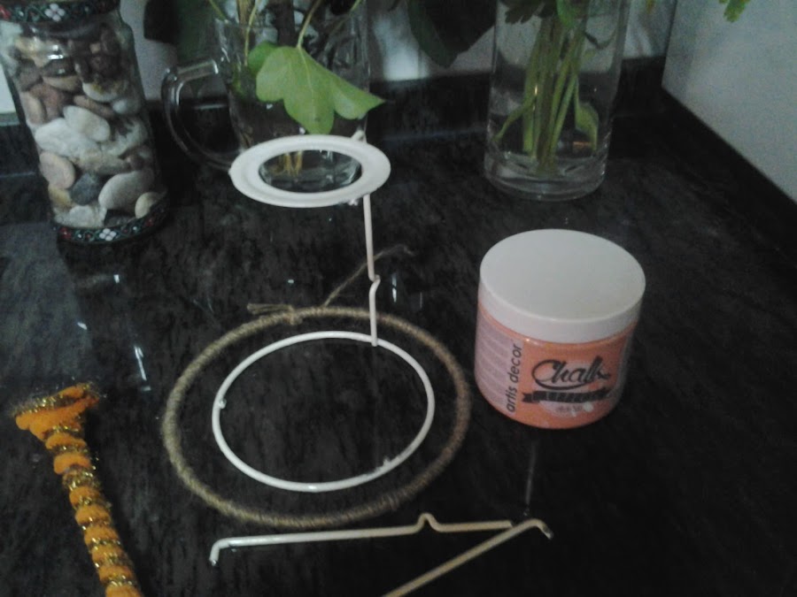Y esto fue lo que quedó de la pantalla, un aro, que ya había forrado con hilo sisal, en la imagen veis , los dos palitos de forja blancos que están en la encimera, los quité y deje solo uno, este fue el momento en el que supe realmente lo que quería hacer.