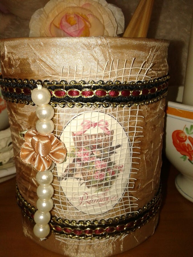 Ya veis, que la decoré, con puntilla, bolitas, flores un decoupage de pajaritos, al que puse como una especie de maya.