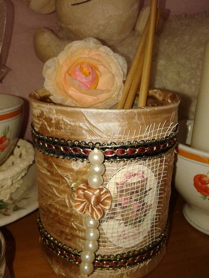 Con la tela de la pantalla, forré un tarrito.