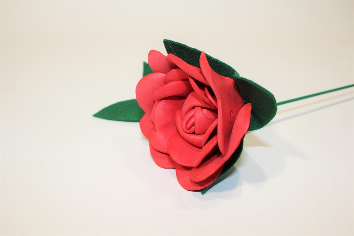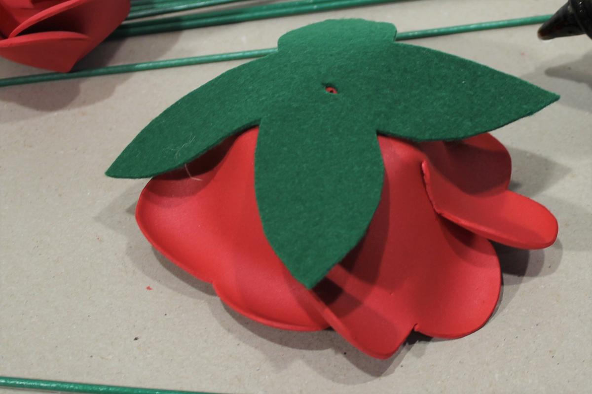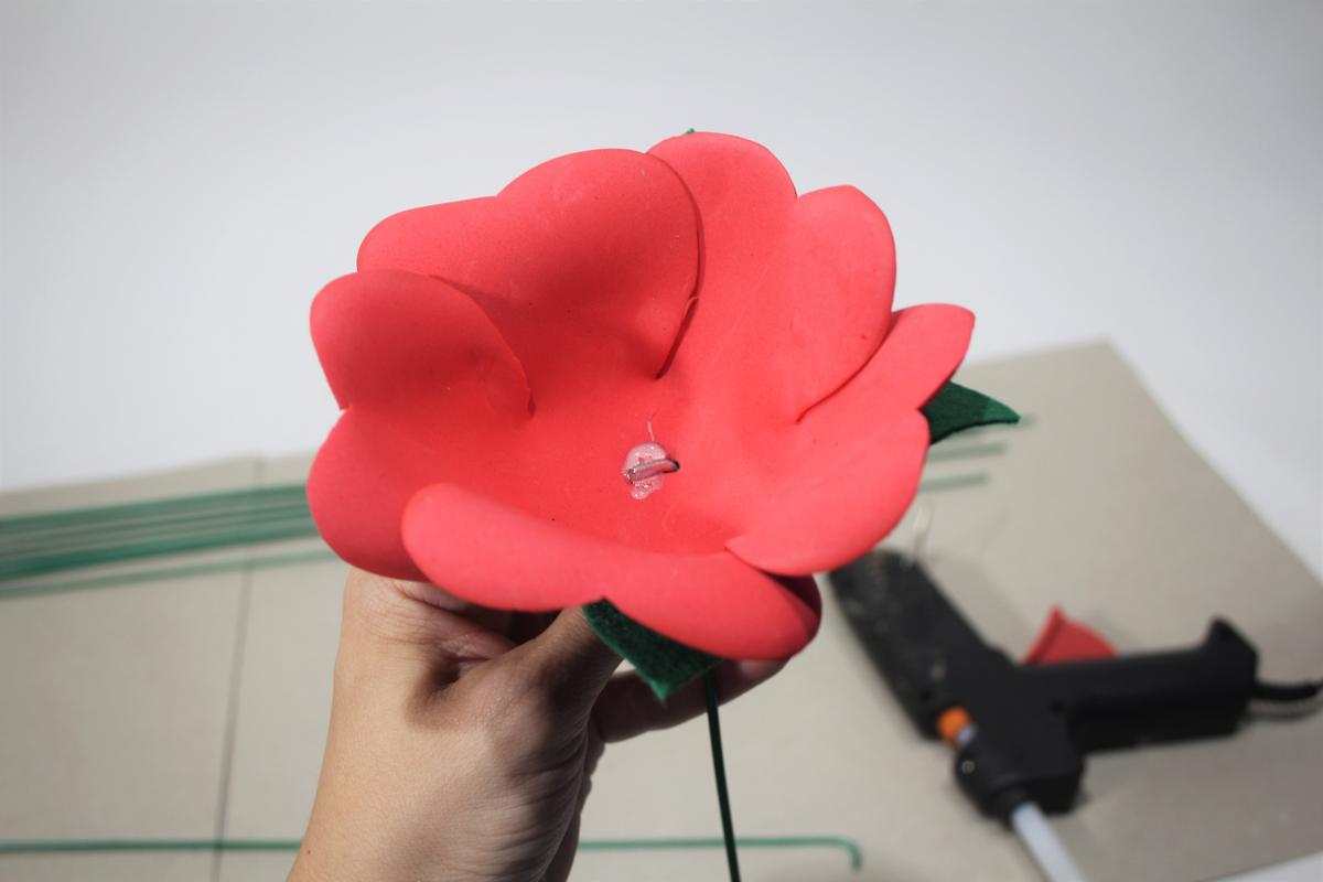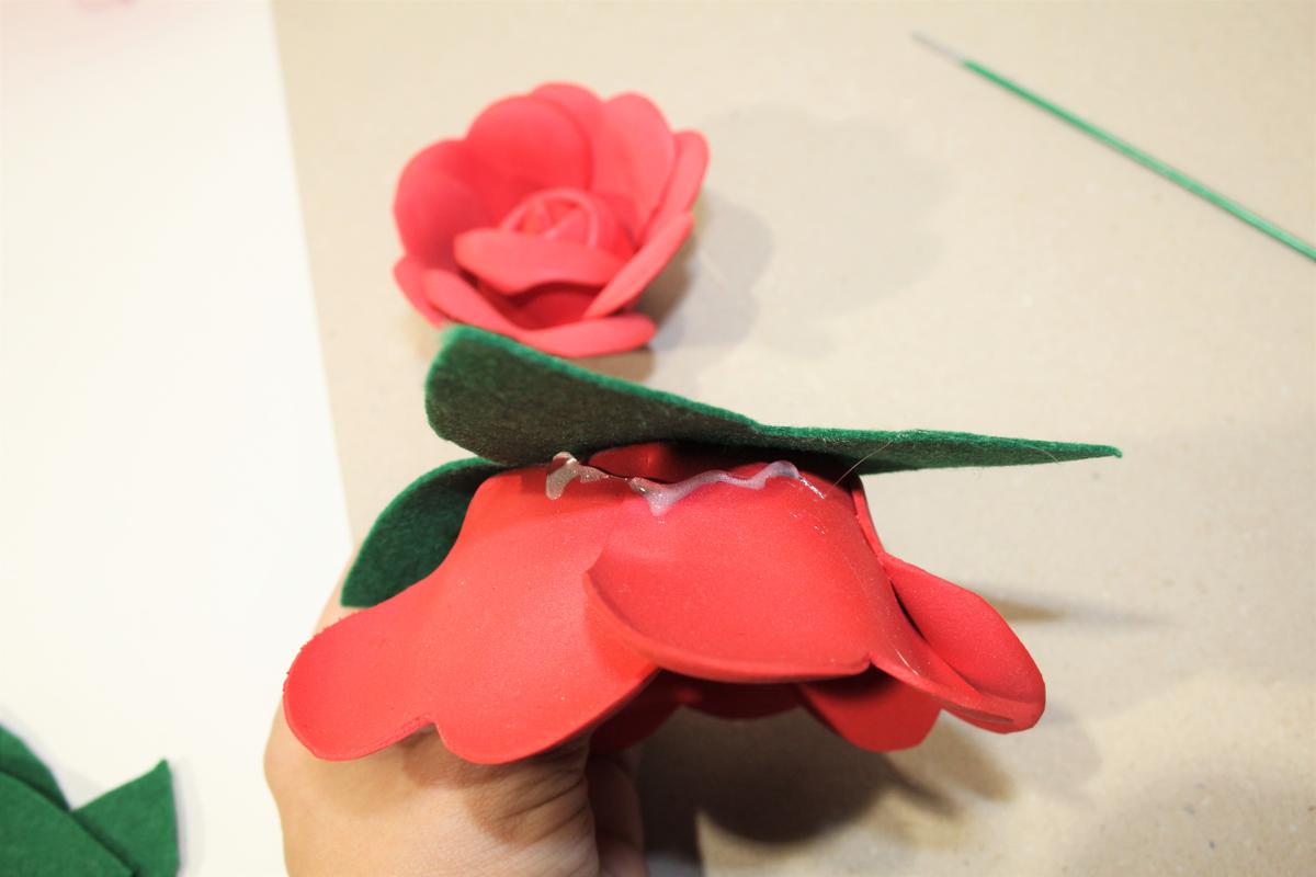 Lo mas fácil para unir la rosa de goma eva y el fieltro verde es utilizar la pistola de termofusión o cola de cianoacrilato. Solo has de hacer un agujero en el centro del fieltro y otro la ultima cazoleta de la rosa, unir las dos partes con silicona y hacer coincidir los dos agujeros, el siguiente paso es pasar la varilla por el agujero y con unas alicates torcer la punta, ponerle bastante silicona caliente y poner encima la otra parte de la rosa, para que quede todo bien unido.