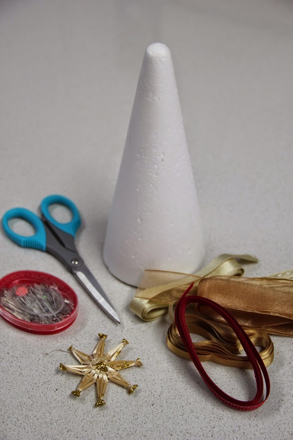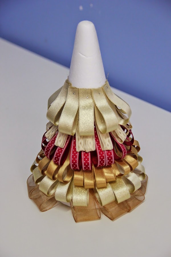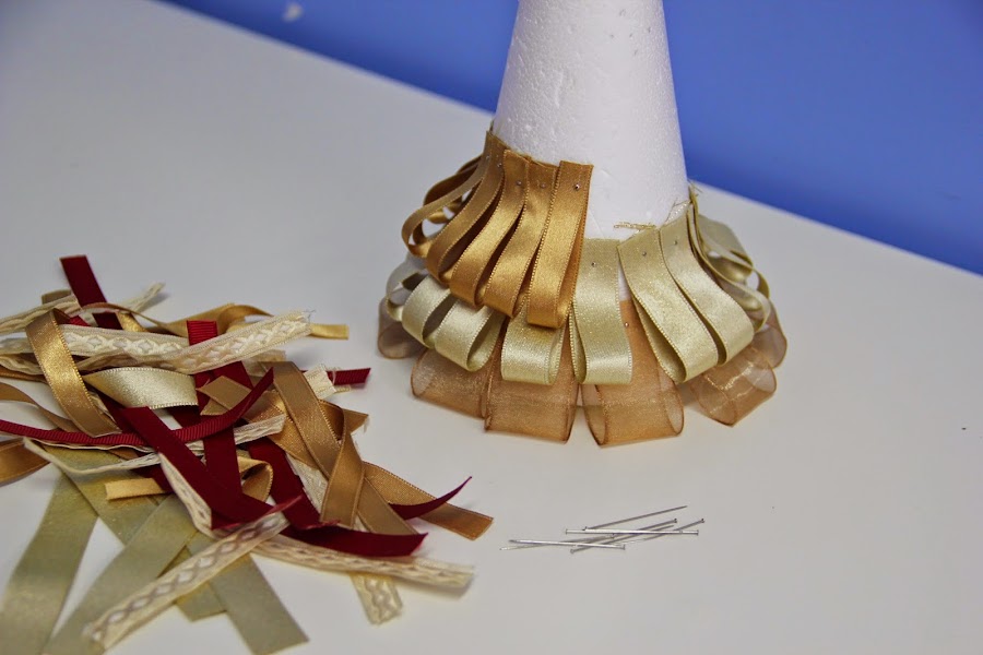 Lo primero que haremos será cortar las cintas y los lazos en trozos de 10 cm y los vamos fijando al cono, dobladas a la mitad, ayudándonos de las alfileres.