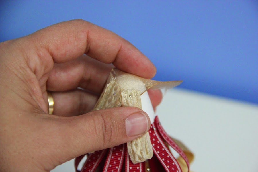 Para terminar, colocamos una cinta cubriendo la parte más alta del cono y fijamos con alfileres a la vez q ponemos la última fila de cintas