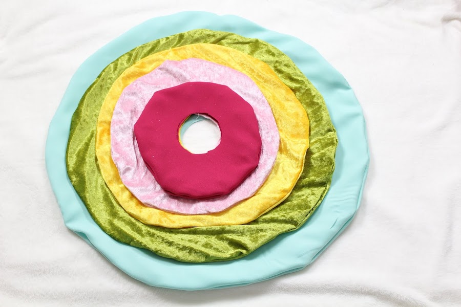 1 PASO: Cortar las telas en círculos, colocando la tela doble marcaremos las circunferencias variando el radio: Radio 35 cm, Radio 30 cm, Radio 25 cm, Radio 20 cm, Radio 15 cm. La circunferencia del interior sera igual para todas Radio 12 cm.