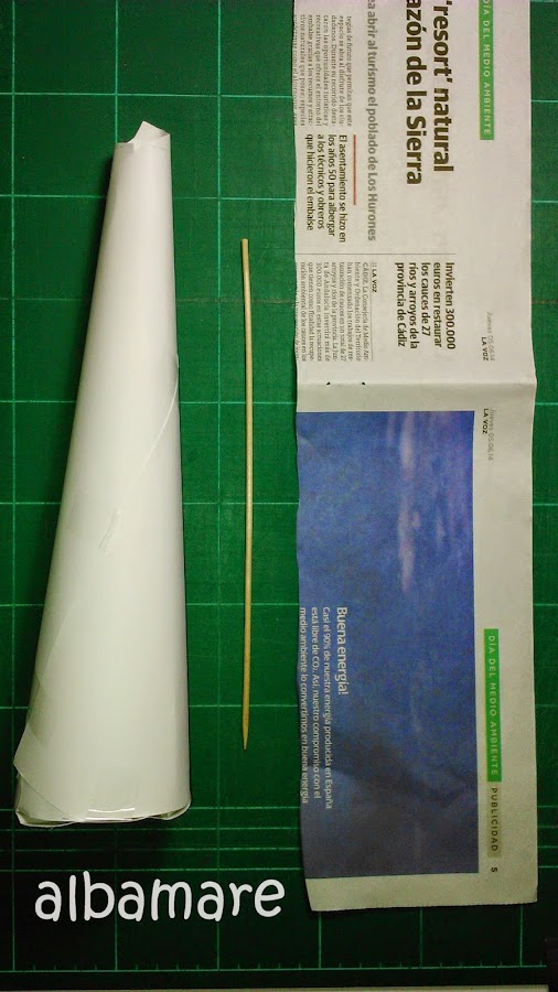 Cortamos las hojas de periódico en tres partes y enrollamos cada parte con el palito de madera (como se ve en la foto) Yo hice alrededor de 50 rollitos.