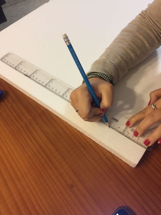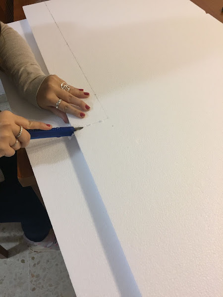 Primero medimos y cortamos con el cúter las diferentes tablas de corcho blanco que vamos a necesitar. Necesitaremos una de 90 cm que será la base vertical y otros que serán colocados horizontalmente de 60, 50, 40, 30 y 20 cm de largo. De ancho deberán tener todos 7.5 cm.