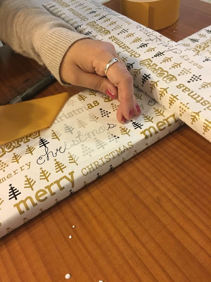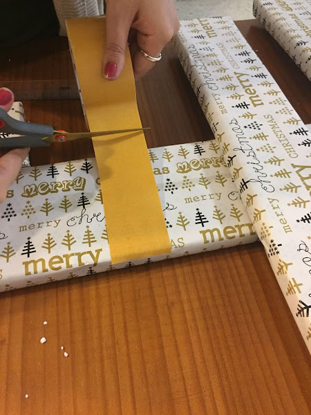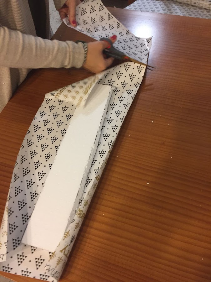 Una vez recortados, pasamos a forrarlas con papel de regalo y cinta adhesiva. Esto hará que luzcan más bonitas y también que estén más protegidas.