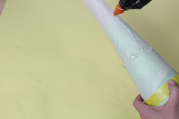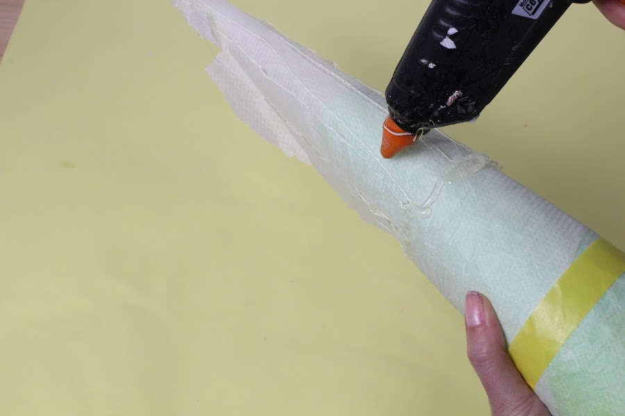 2 Paso: Con la pistola de silicona vamos creando el árbol en espiral ascendente, para que tenga más rigidez vamos llenando huecos con más silicona.