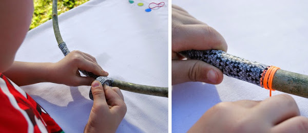 Empezamos a haciendo una pequeña hendidura en cada extremo de la rama, de esa manera podremos atar el hilo bala, que quedará bien sujeto en ambas partes y tenso. ¡Listo! Ya tenemos hechos los dos arcos... ¡Ahora llega lo más divertido! ¡Vamos a decorarlos!