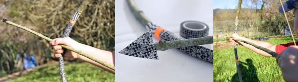 Ya sólo nos falta hacer la flecha, a la que para evitar accidentes ¡siempre hay que jugar con seguridad! le ponemos la punta con washi-tape a juego del arco.