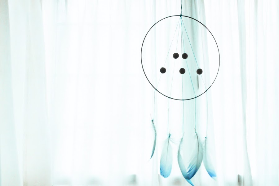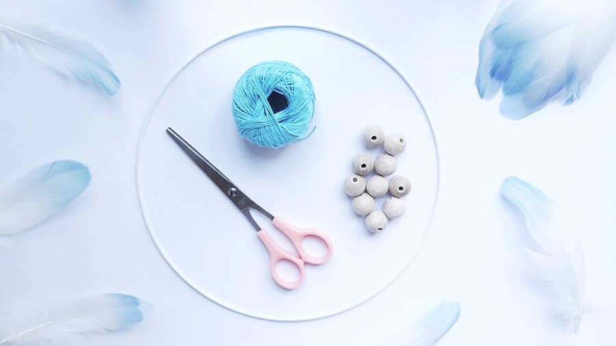 Lo que necesitas para hacerte el atrapasueños es: un aro metálico o un bastidor, hilo del color que prefieras, cuentas de madera, plumas bonitas y unas tijeras. ¿Preparada?