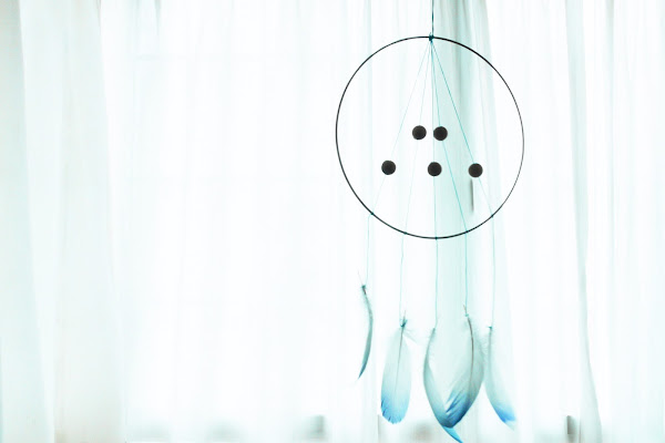 Simplemente hay que anudar varias tiras de hilo en un punto del aro metálico, pasar las cuentas de madera, volver a anudar el hilo en el lado contrario del aro y añadir las plumas ¡Listo!