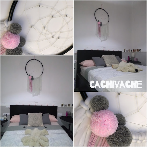 Para hoy os muestro un atrapasueños especial, pues es para un dormitorio, donde la pared del cabecero es muy alta y buscaba algo especial. Tenía que ser un motivo decorativo bastante grande, pero que a su vez no pesara, ni visual ni físicamente. Además debía ser algo juvenil y que fuera de color negro, blanco, rosa y gris.