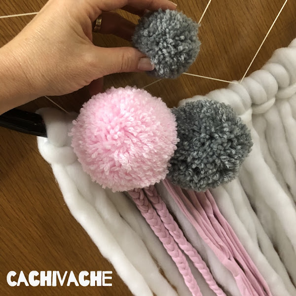 Coloqué la lana alrededor del bastidor. El proceso fue sencillo cortar tiras y unirlas a la mitad, todas de la misma manera. Luego las corté para que estuvieran igualadas. Después puse el trapillo de igual forma, pero a unas tiras les hice una trenza. Coloqué los pompones sujetos con la silicona caliente...