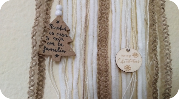 Una vez hecha la parte de arriba, añadí un par de abetos de madera a los flecos de cuerda, en uno escribí un mensaje navideño. También puse una rodaja de madera con felicitación de Navidad. Así le aportaba el elemento navideño y le daba más cuerpo a los flecos.