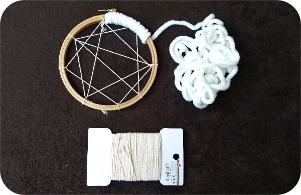 El siguiente paso es hacer la parte central del bastidor, necesitamos la cuerda fina, hay cientos de tutoriales en Youtube para hacer este tipo de decoración, yo no me he complicado y he ido haciendo una especie de figura geométrica que aspira a ser una estrella, simplemente dando una vuelta al bastidor y cruzando la cuerda varias veces.
