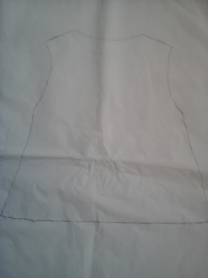 2.- Cogemos papel de patrones, de seda...y tenemos que dibujar el contorno del vestido sin las mangas. Si lo dibujas con el papel doblado por la mitad te saldrá dos partes simétricas. Hay que dibujar el contorno sólo de la tela rosa.