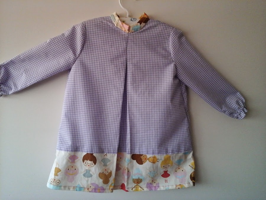 Consejo: hazlo un poquito grande ya que en invierno llevan debajo algún jersey, dan un estirón, y porque si te equivocas es mejor tener tela sobrante ;) 4.- Una vez unidas las tres partes pasamos a coser la parte del bajo en tela diferente, si has elegido hacerlo así. Para ello tienes que medil el largo que quieres añadir sumándole dos centímetros para el dobladillo del bajo. Corta la tela elegida y la coses al resto del babi