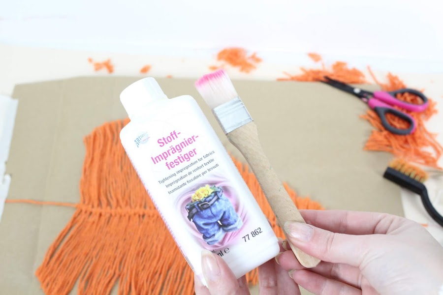 2 Paso: Una vez tenemos la pluma cortada, aplicaremos una cola especial de endurecer textiles.