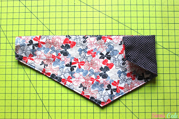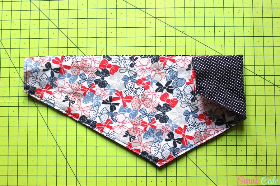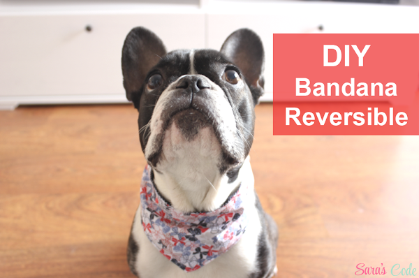 Esta bandana es reversible, pero podéis usar una sola tela y doblarla por la mitad (más fácil todavía!) además, tiene dos huecos para meter el collar.