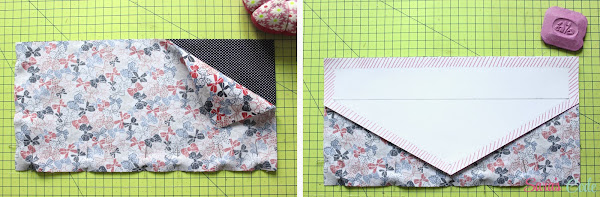 (Si usamos la misma tela, solo tenemos que escoger una tela el doble de alta, doblarla enfrentando los derechos y colocar el borde superior del patrón encima de la doblez.)