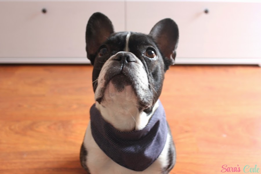 Aquí tenéis a Sookie con su nueva bandana reversible. No se ve muy bien porque he tenido que sujetar un chuche con una mano (sí, esos ojos amorosos no son para mí jajaja) y la cámara con la otra.