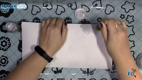Primero se limpia muy bien el cristal, utilizando un algodón impregnado en alcohol para quitar bien los restos de grasa de nuestras propias manos. Luego utilizo cinta de carrocero o cinta masky para marcar un borde alrededor de la bandeja. Con dejar por fuera medio centímetro es suficiente. Y pinto este recuadro exterior con pintura plateada ayudándome de una esponjita (intenté hacerlo con un pincel pero deja menos pintura y me habría tocado dar más manos).