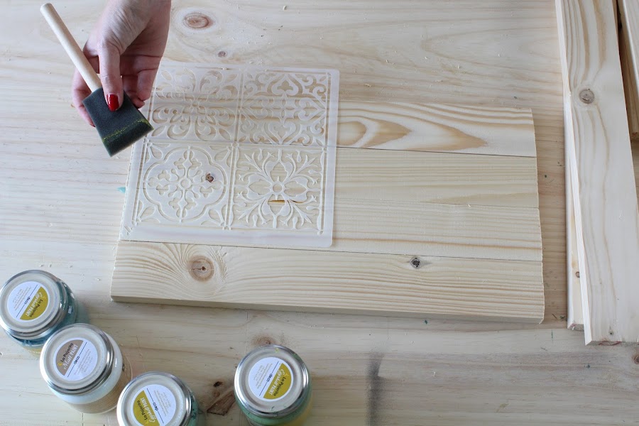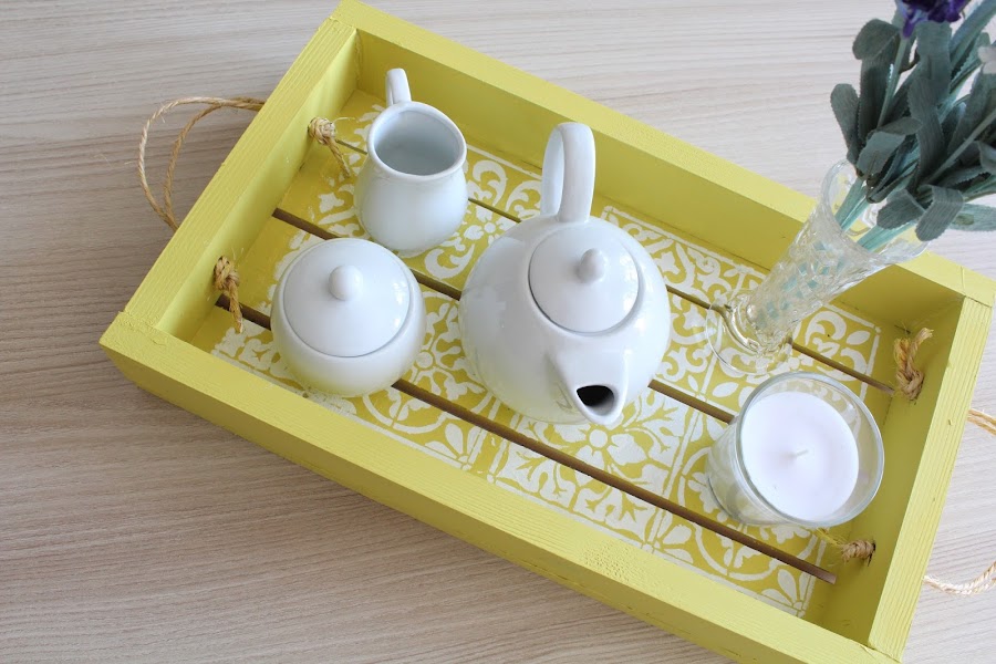 7 Paso: Una vez tengamos la bandeja seca y pegada podemos decorar el fondo con stencil, así le podemos dar un toque más personal.