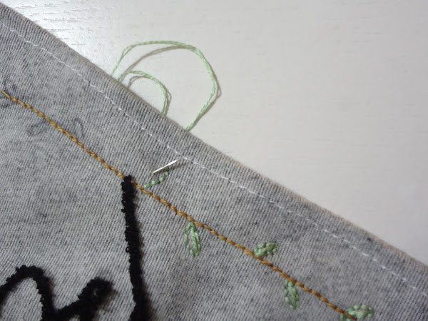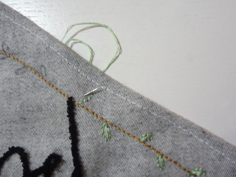 Cuando acabé la frase con la aguja mágica, le bordé las ramas y hojitas en otro color.