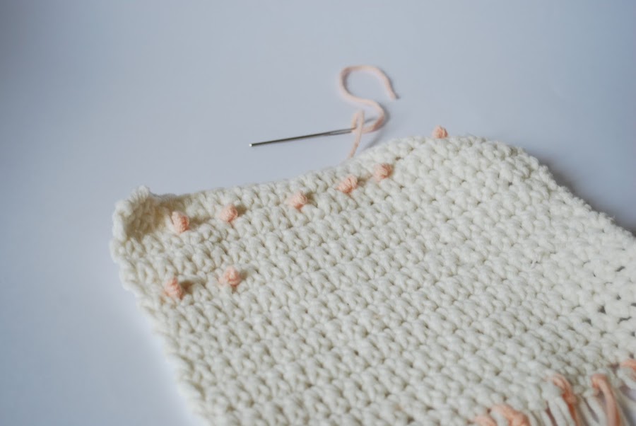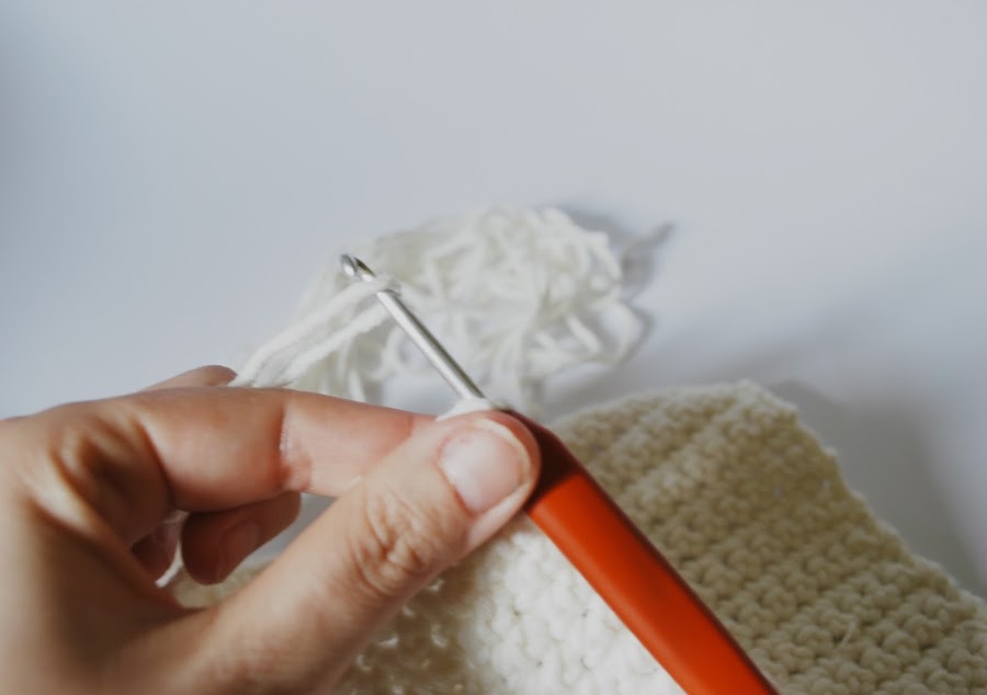 Para hacer los flecos, cortáis tiras de hilo de unos 30cm y con ayuda del ganchillo las vais colocando por toda la parte de abajo. Podéis combinar más colores, hacerlas todas del mismo o cada una de un color distinto, ¡Cómo queráis!