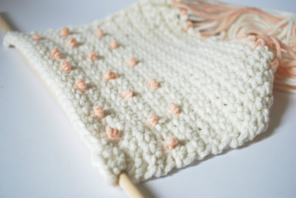 Por último toca decorar vuestro tapiz, aquí ya si que podéis dejar volar la imaginación y hacer lo que os dé la real gana, en mi caso he hecho tres filas de punto nudo en el mismo color rosa de los flecos para darle un toque. Pero también se me ocurre que podéis bordar lo que queráis, poner pompones, hacer las filas de distintos colores o hacer tipo jacquard incluso y crear el dibujo con el ganchillo.