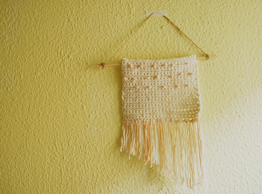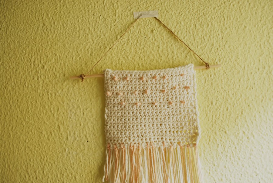Para sujetarlo al palito de madera yo lo he pasado directamente por los extremos para que quede tenso, y para colgarlo a la pared he utilizado hilo natural con dos nudos en los extremos.
