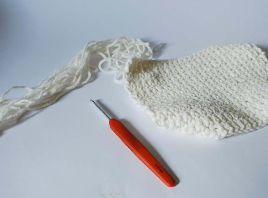Lo primero que tenéis que hacer es un cuadrado, rectángulo o forma que queráis. Para el mío he usado una aguja del 5 y he empezado con 25 cadenetas y he ido haciendo filas de punto bajo hasta que