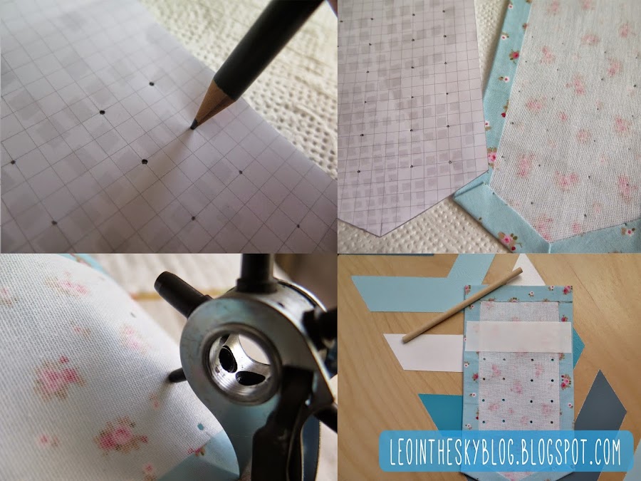 Ahora es el turno de hacer los agujeritos donde irán los pendientes. Primero marco con un lápiz las posiciones, ayudándome con el patrón y luego hago los agujeros con el sacabocados (made in china por supuesto).