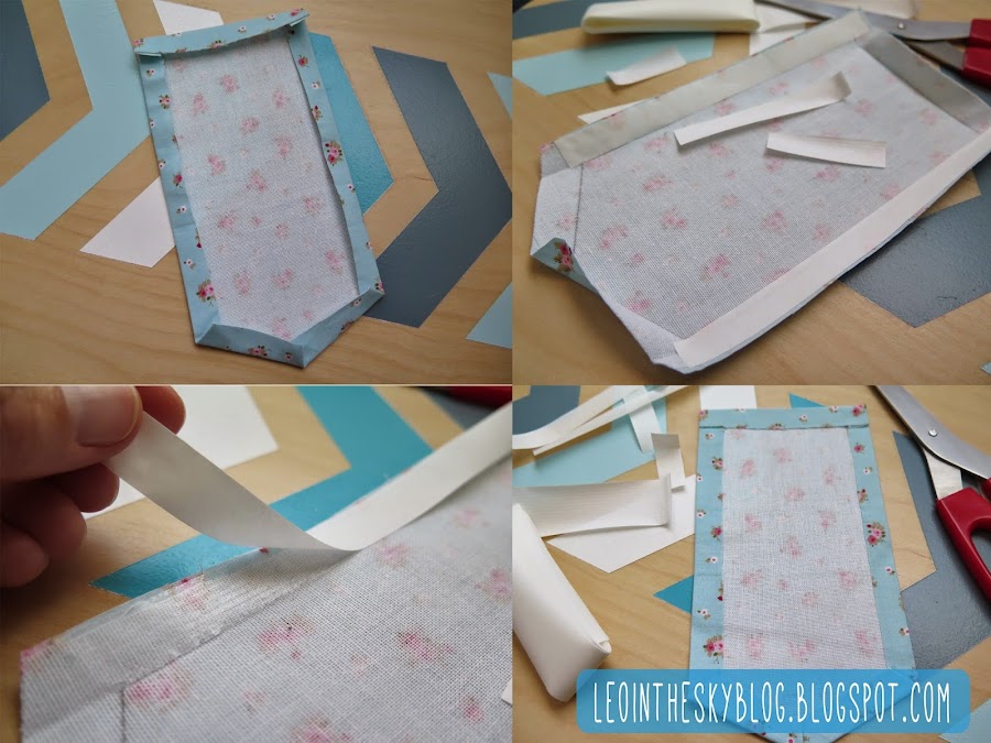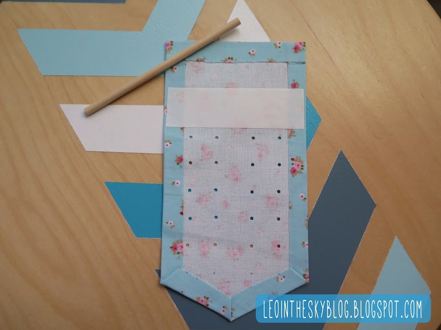 Después se pega la entretela a la tela con la plancha y se recorta la forma del banderín dejando un margen de 1cm más o menos. Planché hacia dentro los bordes para poder planchar después la cinta adhesiva y de esta forma crear una especie de dobladillo para el banderín y que no se deshilachen los bordes.