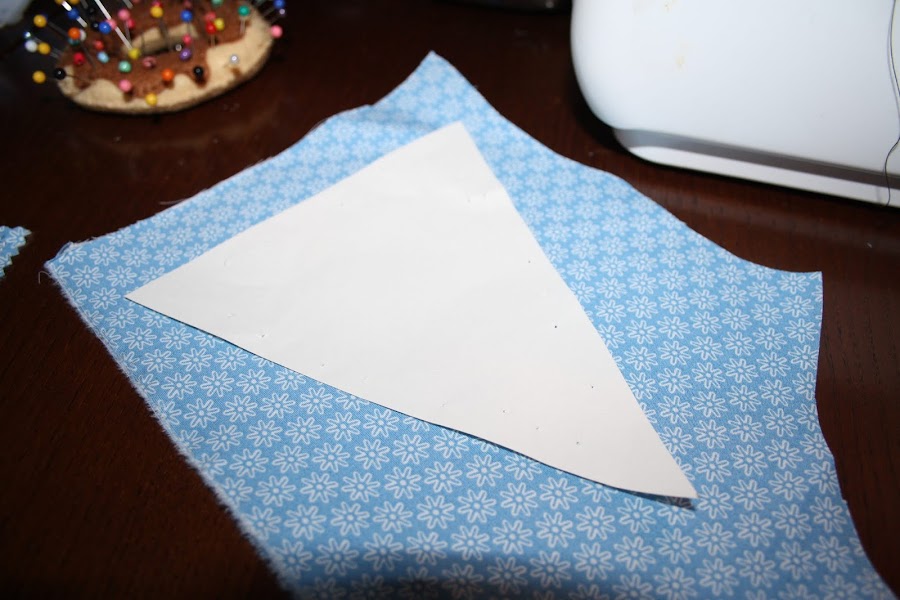 Es tan fácil que casi no necesita explicación. Escoges las telas que quieres usar y después de recortar en papel una plantilla de un triángulo lo pasas a la tela.