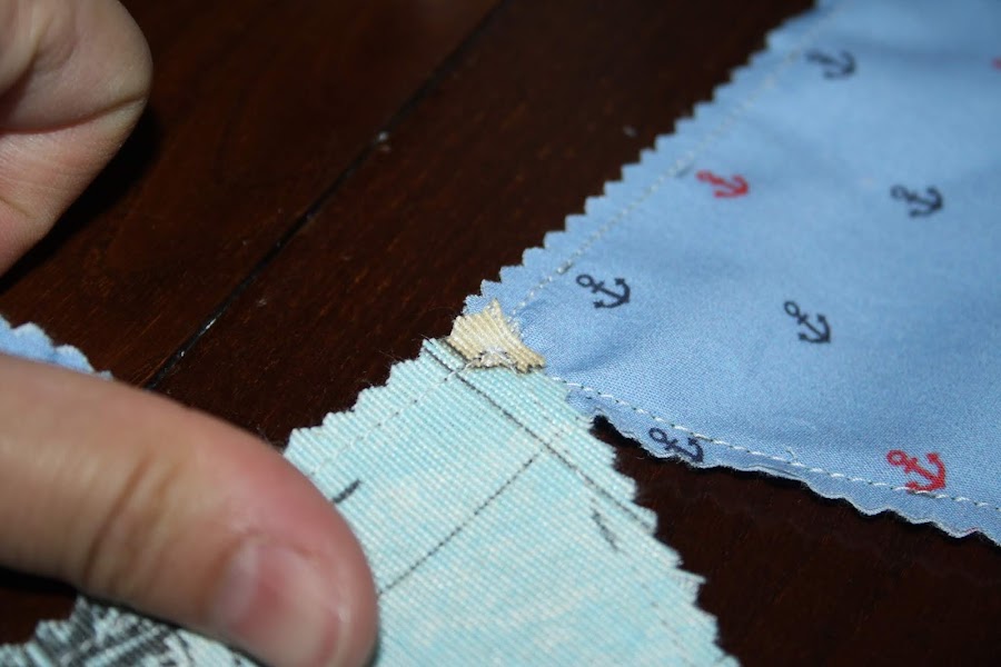 Cosemos por donde hemos marcado.A continuación cortamos con una tijera en zig-zag para que la tela no se deshilache.