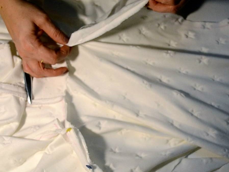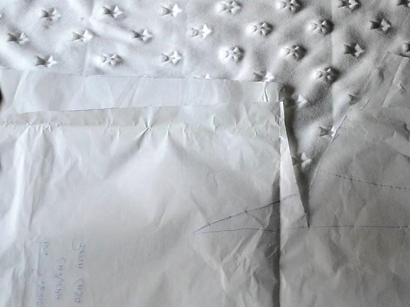 Lo primero que hacemos es doblar la tela por la mitad, a lo ancho de la tela, poniendo derecho con derecho hacia adentro y el revés hacia afuera, en el revés pondremos los patrones con alfileres y con un carboncillo lo marcaremos todo alrededor para que quede marcado todo el contorno de las piezas a cortar y coser.