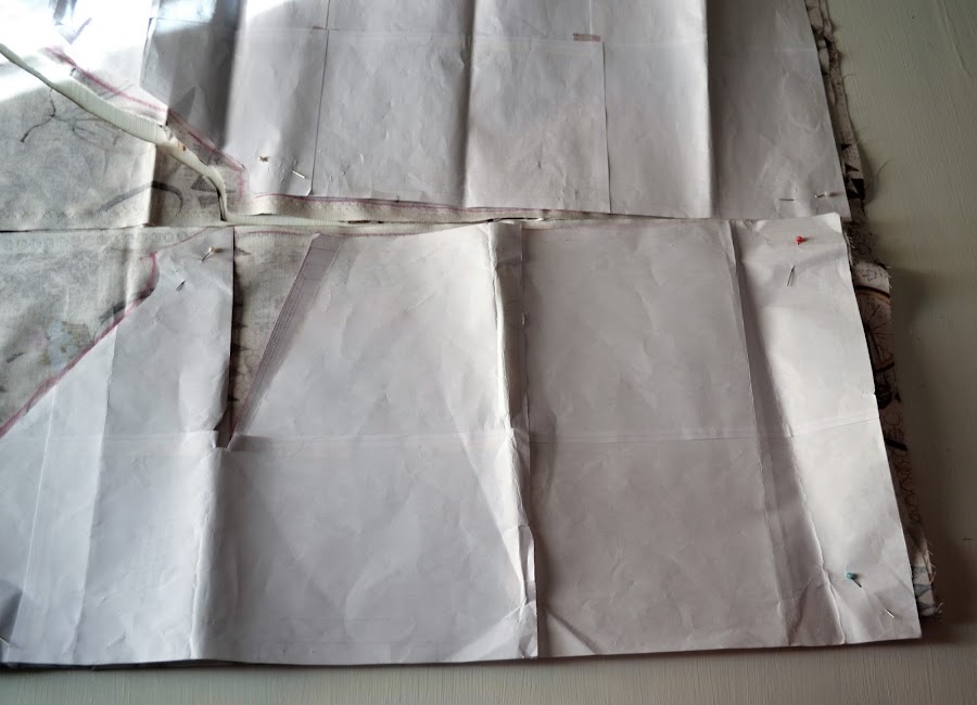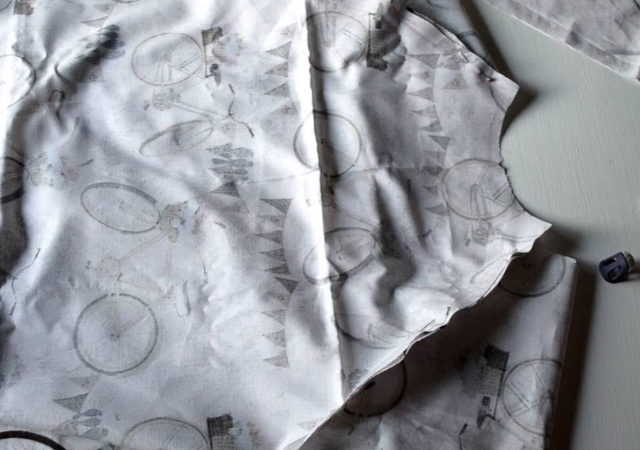 Lo primero que hacemos es doblar los dos bordes de la tela hacia el centro poniendo derecho con derecho y dejando hacia afuera el revés. Ponemos a cada lado un patrón, delantero y espalda, poniendo el centro del patrón en cada doblez, así no cosemos en el centro de la espalda ni del delantero. Ponemos también el patrón de la manga y dibujamos el contorno de los patrones en la tela, cortamos.