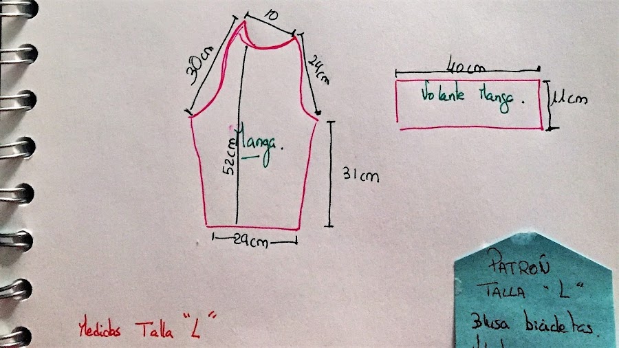 - Patrón, que yo os dejo una foto de las medidas y como hice yo mi patrón. Estas medidas son las de mi patrón, deberías adaptarlas al vuestro, tal vez necesitéis más talla o menos o si os gusta más amplia o más estrecha.