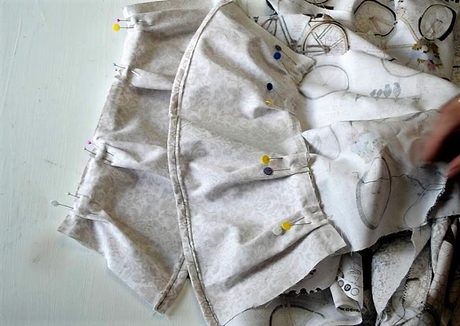 Unimos las mangas al delantero y espalada, primero con alfileres y luego pasamos pespunte a maquina. Luego hacemos los pliegues a los volantes con alfileres y lo sujetamos a las mangas para pasar un pespunte.