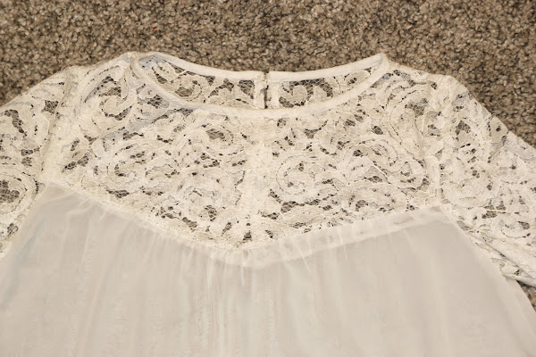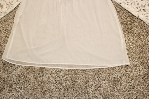 Las telas que hemos utilizado son: encaje rebrodé de flores en color blanco, este lo compré en Ribes y Casals y me costó 8,45 euros el metro. La gasa también la compré en Ribes y Casals, este tipo de gasa transparente la podéis encontrar en muchos colores, su precio es de 4,75 euros el metro.